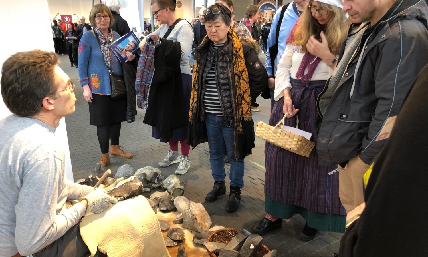 Claus Hirch, Haderslev, begejstrer i Øksnehallen i København med sine evner til at behandle flinten fra bl.a. Als og Thy. Han er en del af den sønderjyske stand, hvor bl.a. Museum Sønderjylland og og Historisk Samfund sælger bøger om landsdelens historie.
