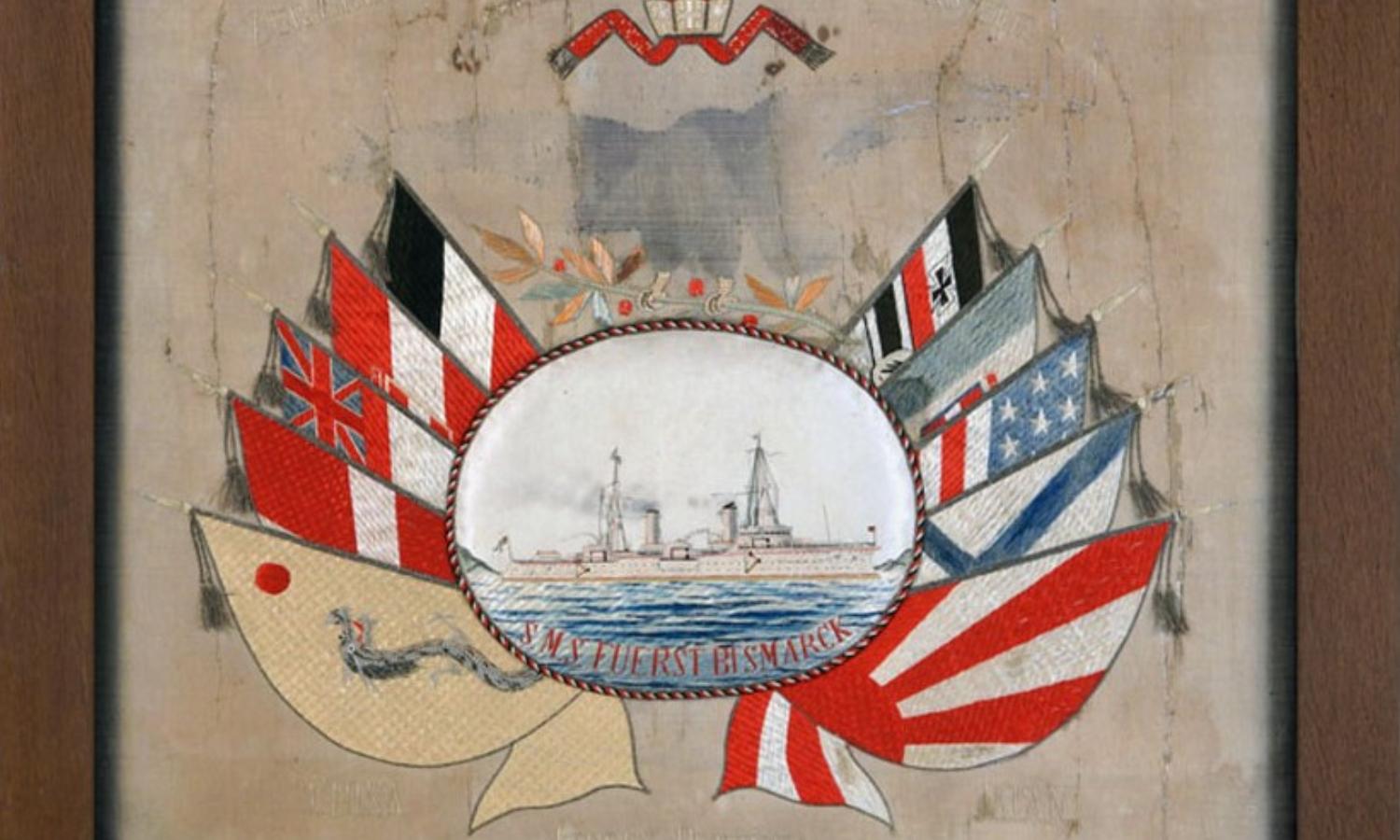 I årene 1901 til 1904 aftjente Jørgen Petersen sin værnepligt om bord på den splinternye krydser SMS Fürst Bismarck. Krydseren havde været med til at nedkæmpe bokseropstanden i Kina og skulle nu opretholde tysk kontrol med kolonierne i fjernøsten. Som et minde om sine oplevelser fik Jørgen Petersen i december 1903 fremstillet dette silkebroderi i Nagasaki. Krydseren er smukt broderet i midten, omgivet af flag fra de nationer, der havde deltaget i nedkæmpelsen af bokseropstanden. Broderiet hængte han op, da han kom hjem. Det har tilsyneladende hængt i sollys, for den blå farve er stærkt falmet.