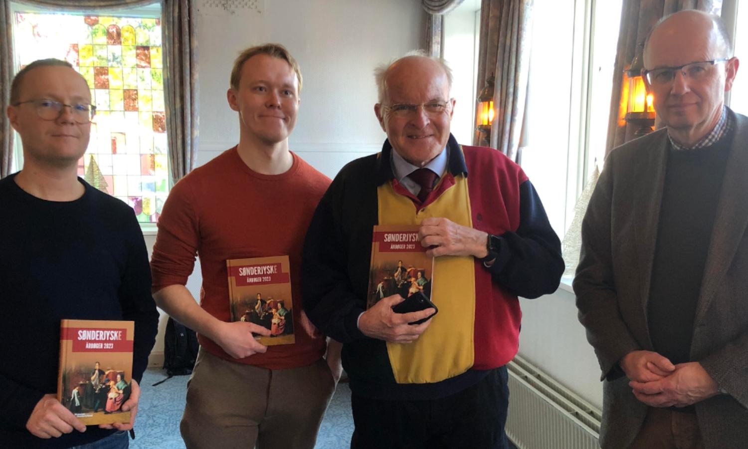 Fra præsentationen af Sønderjyske Årbøger 2023. Fra venstre årbogens redaktør, Mads Mikkel Tørsleff, to af årbogens forfattere, Emil Bliksted Lange og Helge wiengaard, og formanden for Historisk Samfund for Sønderjylland, Hans Schultz Hansen.