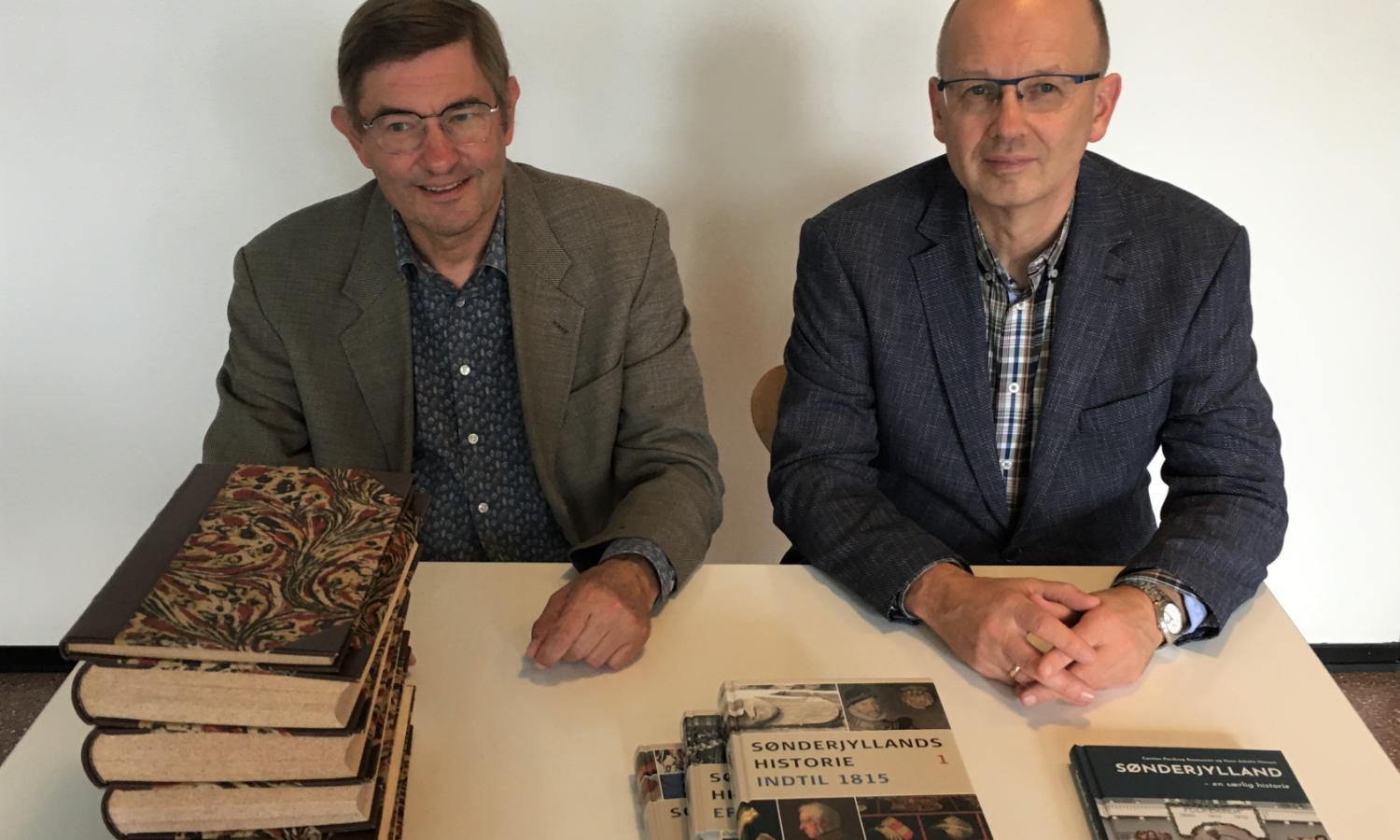 Forfatterne Carsten Porskrog Rasmussen og Hans Schultz Hansen med 3 udgaver af Sønderjyllands historie.