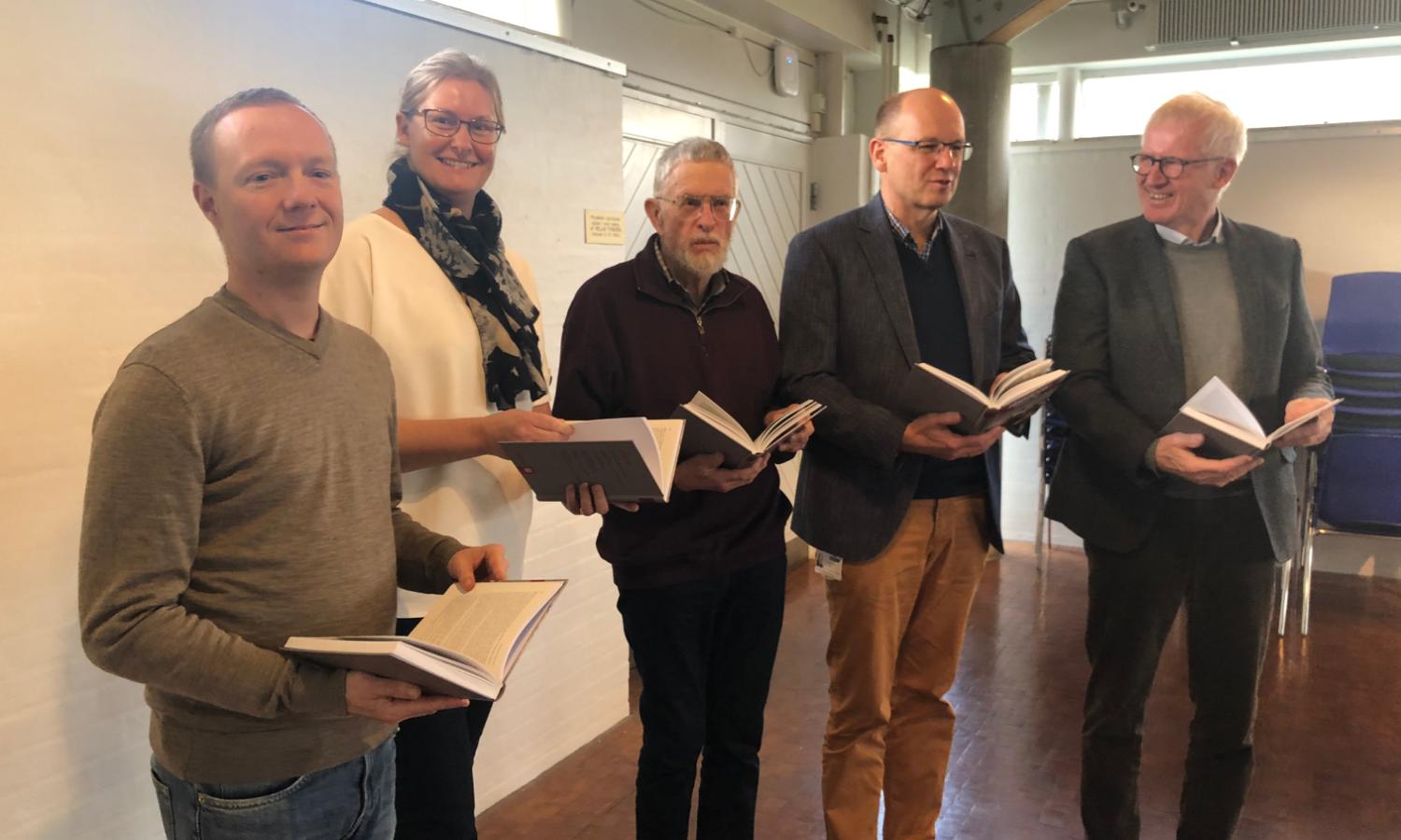 Foto her: Fra venstre Mads Mikkel Tørsleff, årbogsredaktionen, forfatterne Lisbeth Aagaard Lykke, og Henning Nielsen, formanden for Historisk samfund for Sønderjylland Hans Schulz Hansenog yderst til højre Jens Andresen Løgumkloster.